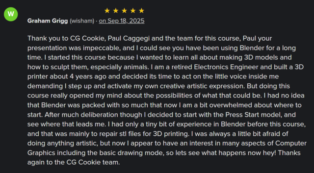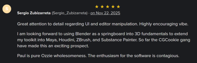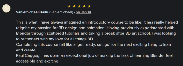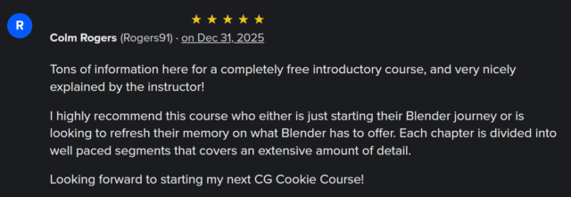 This course is also free on CG Cookie’s Youtube Channel, but the advantage of taking a free course via their website was always the community interaction and access to course content – which I also supplied.